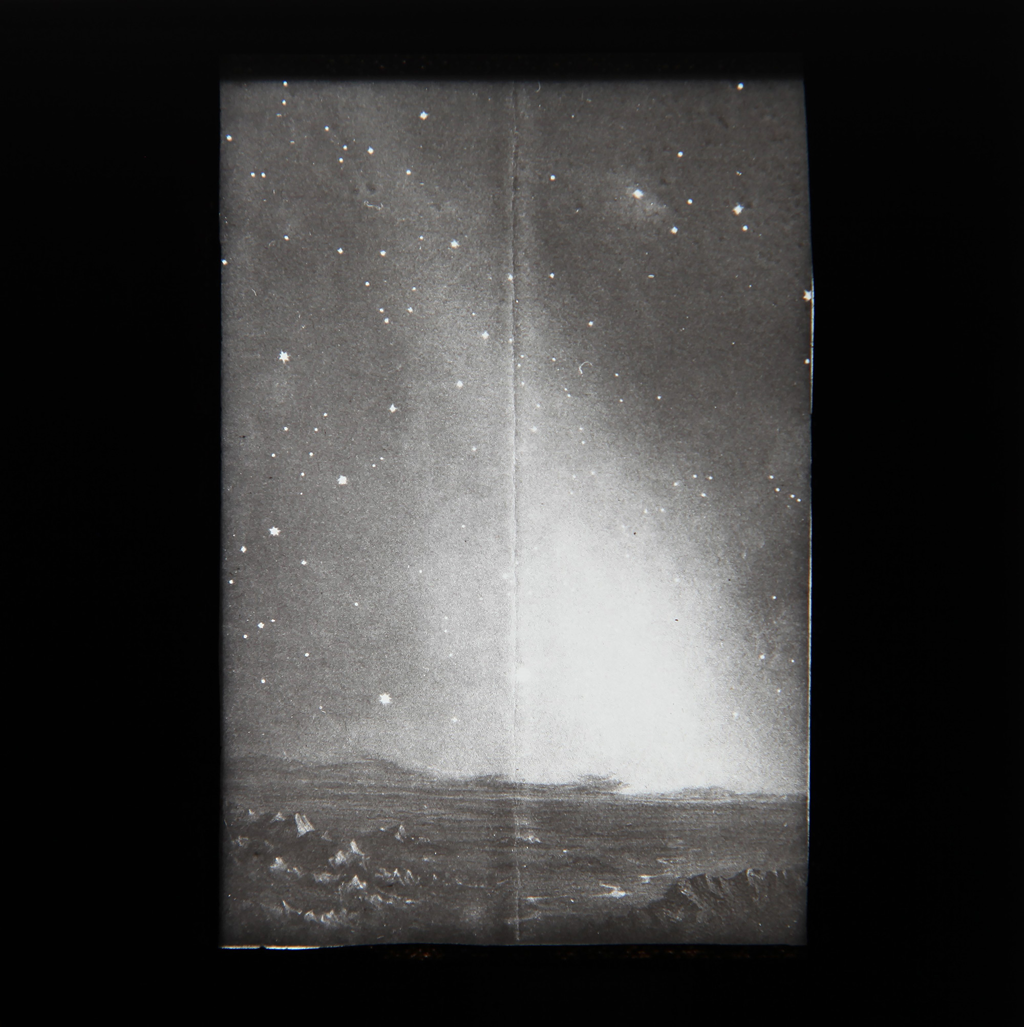 A depiction of the Milky Way visible in the night sky from Earth, reproduced on a lantern slide. Photograph by Alexi Baker, 2021. Courtesy of Baker, Division of History of Science and Technology, Yale Peabody Museum.